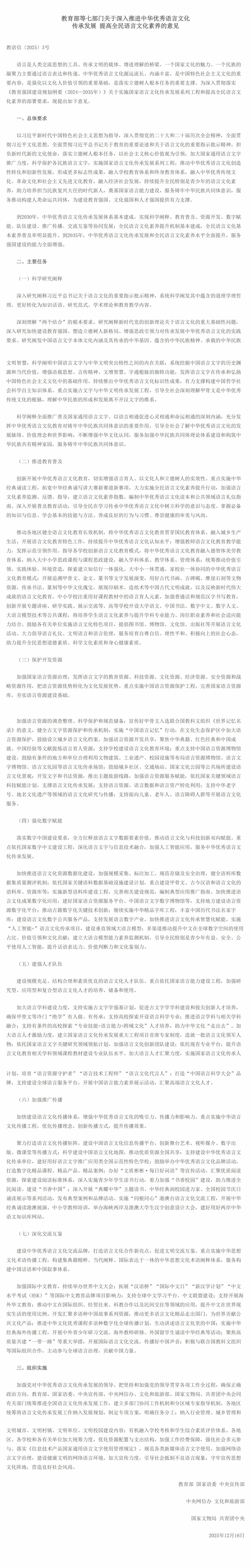 教育部等七部门关于深入推进中华优秀语言文化传承发展 提高全民语言文化素养的意见